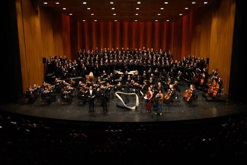 In June 2023, Voces Novae traveled to London to join with Vox Anima and choral groups from around the world for the UK premiere of Elaine Hagenberg’s Illuminare. VN members joined the Eagles onstage as part of their “Hotel California” tour stop at the KFC Yum! Center in 2022. The Louisville Orchestra (LO), under the direction of Teddy Abrams, performed Beethoven’s Ninth Symphony in 2019, inviting Voces Novae to perform with them onstage in collaboration with U of L’s Collegiate Chorale, the Louisville Chamber Choir, and several local-area high school and church choirs. In years prior, VN performed Carmina Burana with the LO, as well as another iteration of Beethoven’s Ninth, directed by Jorge Mester.
